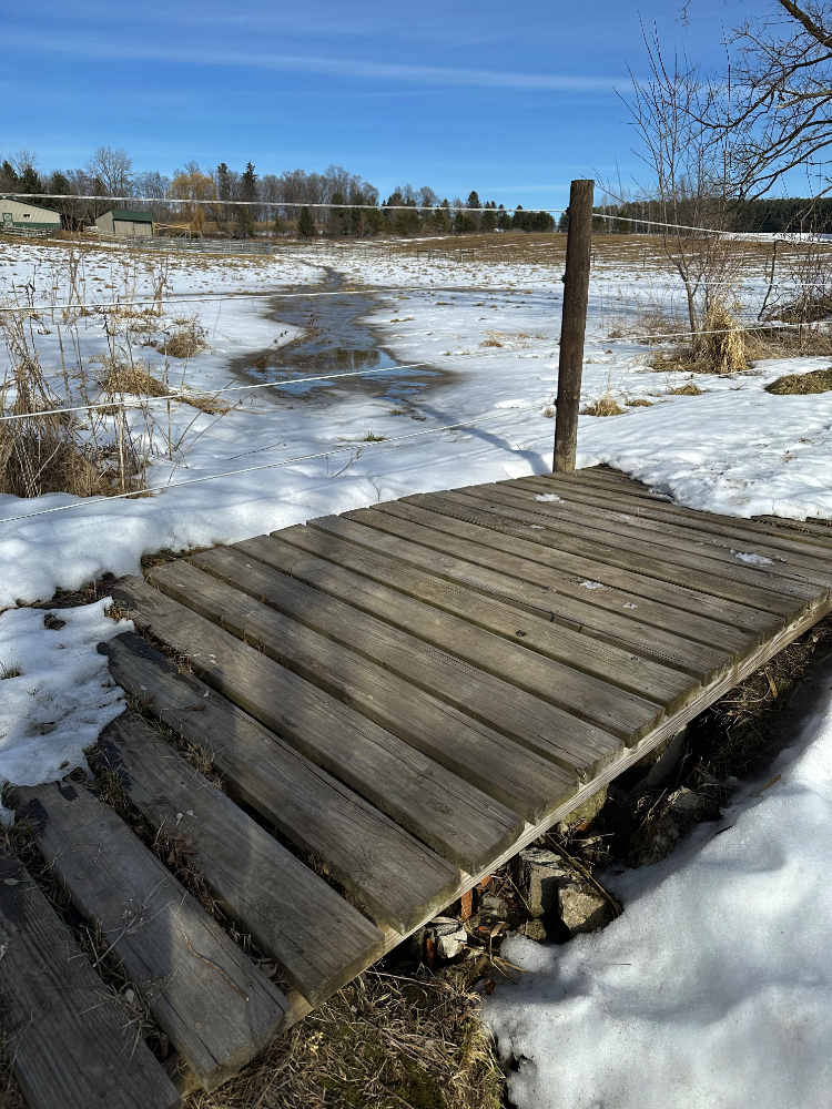 By early afternoon, the meltwater was flowing down the drainage swale that passes across our fields. It’s an unsettling reality in February. I haven’t seen any news reporting the crazy weather occurring in the UK lately, but our friend, Ian Rowcliffe, in Portugal, informed me of their ongoing doses of heavy rain causing flooding.