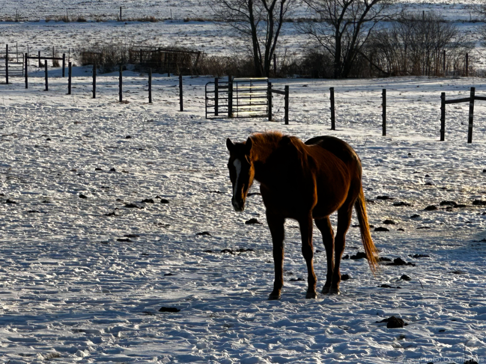 Winter has loosened its icy grip by about 35-40° (F) [think about going from 20-below to 20 above], providing the horses with a break from blankets for a little bit. Mia’s regular blanket went back on for a while because overnight temperatures were still dipping into the single digits. I’m guessing she might be able to go “au naturel” again later today.