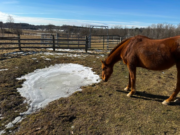 When I walk in the paddocks, I strive to place my boots where the surface looks like it will support my weight. If I make enough trips back and forth, I can pave a smooth path. At the same time, any ground that is thawed where a horse places a hoof becomes a deep crater. A 1,300-pound body can sink its feet more than half a foot into the soil.