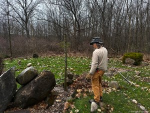 I pruned the weeping crabapple tree, contemplating the odds that it will be flowering in all its glory during the first weekend of May. The log stools around the fire pit had rotted to the point of disintegration. I toppled them and rolled the pieces into the brush beyond.