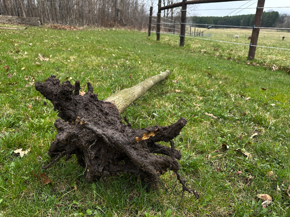 I wrapped my hand around the trunk and pushed and pulled to see how much it would sway. The saturated ground made it sound like the roots were moving in standing water. Not having a saw with me at the moment, the tree stands for another day. One of the upper branches has already snapped off. I found it scattered on the ground below about a month ago.