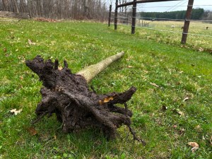 If I wanted to use the big tractor again, we’d need to move enough pathway rocks to make a lane for the tractor to reach the center. We would also need to wait until the ground was frozen enough to keep the wheels from sinking into the soft turf. The reason I was able to pull the trunk of the maple tree is that it is so squishy down there right now.