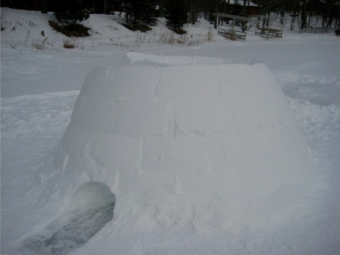 We worked awful hard at playing yesterday. It was absolutely beautiful winter weather. Lots of sunlight even though the sky wasn’t quite clear blue and the wind was negligible. There was a hint of an outline from a previous rink someone had created on the lake, but it didn’t look like it was very big and it didn’t look like it had a good shape, so I elected to start from scratch. So, while trying to learn how to use the new tool for making igloos that I got for Christmas, I was also shoveling the perfect size and shape rink for a game of boot hockey. Our friends, Mike & Barb, were here to help and while Cyndie and I scraped the crust off the ice surface, they got in a snowshoe hike. We made slow progress on the igloo, with all the interruptions and our learning curve of technique, but thinking back to many other igloo construction projects, I often don’t get the whole thing done in one day. Several of our interruptions were a result of other people stopping by. A variety of folks who were out for a walk, ski ,and snowmobile ride, stopped by to inquire about our project. I guess it has something of a visual appeal. I shouldn’t be surprised. I found myself wanting to just stare at the product of our efforts as I climbed the stairs back up to the cabin at the end of the day.