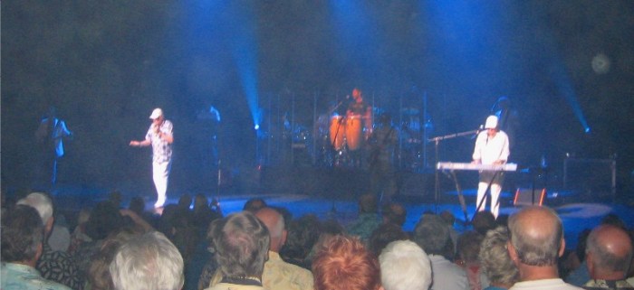 One way to get over being too close to so many scantily clad human bodies is to go to a show where the crowd of people are fully dressed and all synchronized in joint adoration and celebration of a classic American rock band. We celebrated The Beach Boys by going to a concert where two of the original band members, Mike Love and Bruce Johnston, along with part time celebrity member, John Stamos of television’s Full House fame, and Mike Love’s son, Christian, among other supporting musicians, did excellent renditions of the songs already permanently stored in our heads. If you notice in the photo I captured of the event, their music has been around so long that the audience is starting to show its age. On stage, you can see Mike Love, on the left, and Bruce Johnston, right, all lit up in white as the actual Beach Boys. John Stamos is highlighted a little more subtly, playing congas.
