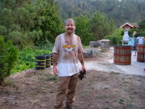 After the grape press is painted, Cyndie receives further instructions from Ian on caring for the horses. She is planning on moving them down to the bottom field. Ian and I set off to cut the growth that has consumed the area around the spring on the far side of the property. It is a tremendous task, as the thicket of “bramble” climbs twice as high as we are tall. The cutting process covers me with dust from the shredded dead, dry stalks and I look quite