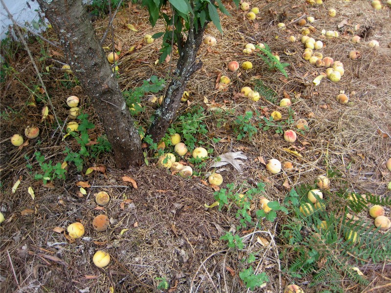 In the morning, Cyndie had the intention of picking a few fresh peaches for her breakfast. On the way to the peach tree, she said hello to the horses and gave them grain. Then she headed around to the peach tree and discovered there were a great bunch of ripe peaches. She would need a bag to put them in. After a trek for the bag, she started gathering the fruit, only to find they were falling onto the rotten peaches lying in the manure fertilizing the tree, so she decided to collect some fresh ground cover to lay on top of that. Ian told her that any of the old straw accumulating around the outside of the stable area is fair game to use for that, so she began a chore of collecting it. Thus, in so doing, she ended up cleaning the entire area surrounding the stable and shade house, hauling wheelbarrows full of new ground cover. While cleaning, she came upon the fig tree that had grown into the shade house area and realized there were irresistible numbers of figs that were ripe for picking. She needed to get a ladder for that task. On the search for the ladder, she discovered the patio in front of the tool room deserved to be swept and the laundry needed to be put out. She was also looking for a pail with a handle, to use for collecting figs, but came up empty on that search. Left to using the original bag she had started with, she realized that the figs, added with the peaches, became too heavy and squished themselves when she picked up the bag, so she went for the wheelbarrow to hold all the fruit.