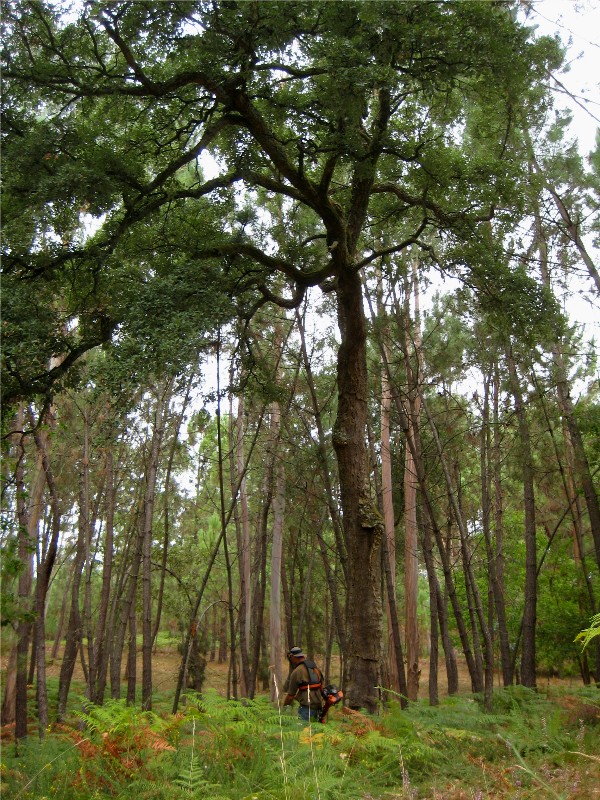 On our way back from the spring, Ian drove a route I had not yet seen, and when he spotted the biggest and oldest cork tree on the property, he became inspired to stop and cut around it. He described, and then showed me, how the trees form a sort of cathedral up to a spot of large moss-covered stone. The thought occurred to him that the arrangement of trees may have been inspired by cathedrals, or quite possibly, it was the other way around.