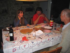 When we arrived, Carlos and his daughter, Rita (15 yrs), came out to greet us and help carry things inside. They offered a nonalcoholic grape drink that, to my palate, was less grape juice and more wine that hadn’t yet fermented. Carlos provided a brief tour, out to see his beautiful horses and walk a bit of his picture-postcard gorgeous property. He has a fantastic grove of olive trees and a significant number of grape vines. Cyndie had placed food in the oven to get it heating, and I am surprised we got away with being out of the kitchen as long as we were, without burning something. It is quite a feat that Cyndie pulls off, first preparing the food in advance in Ian’s kitchen, which is foreign to her, and then stepping into Carlos’ house for the very first time and accomplishing the meal in his kitchen!