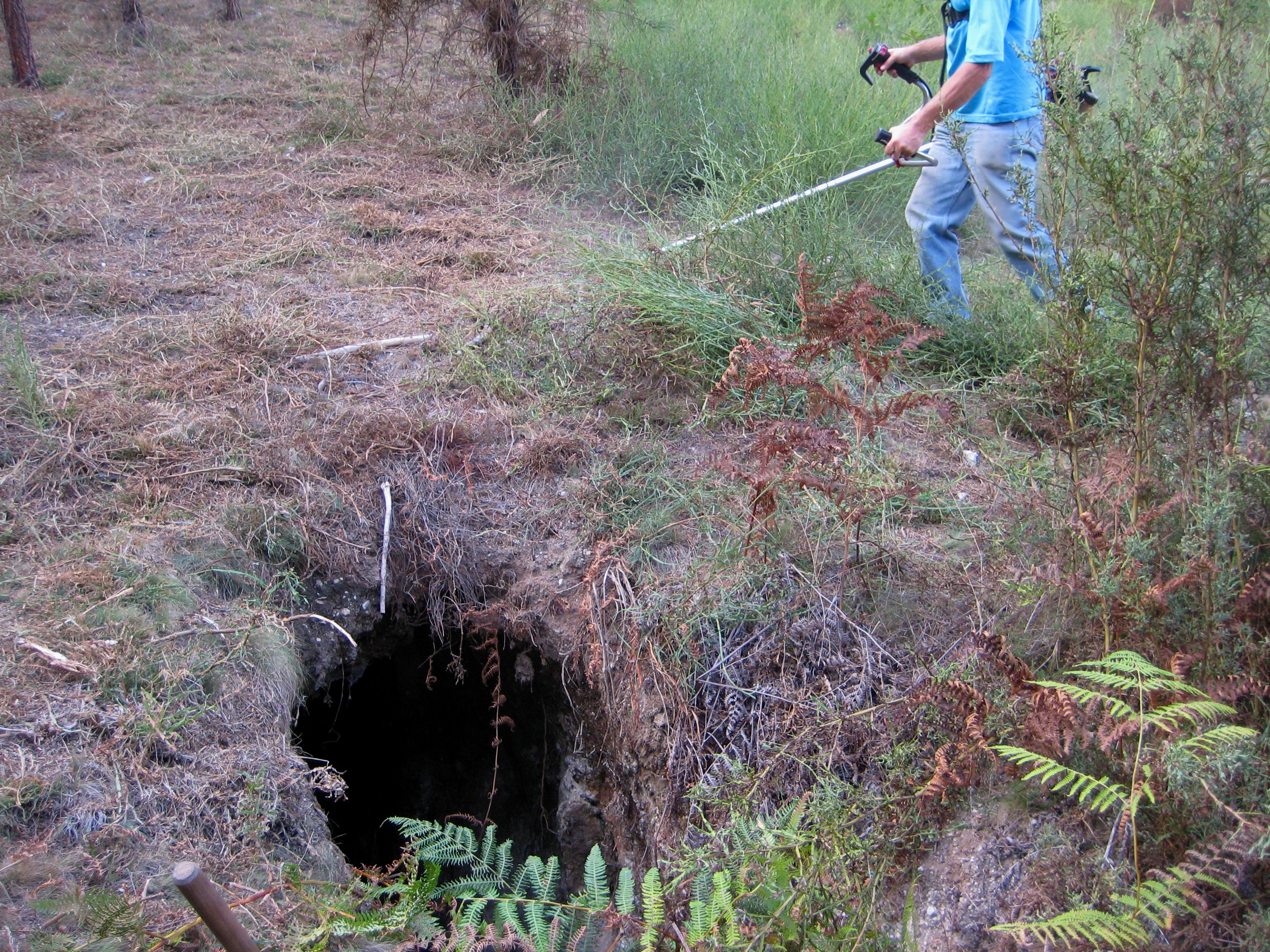 The next task that needed to happen was getting fresh cuttings for the horses to eat, before we bring them back up from the lower field. Ian used the power tool to cut, and I raked and packed bales into the Forester. Up on the hill where he was cutting, Ian realized he hadn’t showed me the mine shafts that had been dug, in search of water many years ago. He said it is the way they used to do it. There are apparently 3 in the area, and none of them found water. I was duly impressed. It seems rather high up to be searching for water, but it must have proved successful somewhere in the past for them to work that hard in such a search.