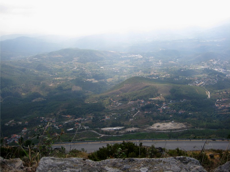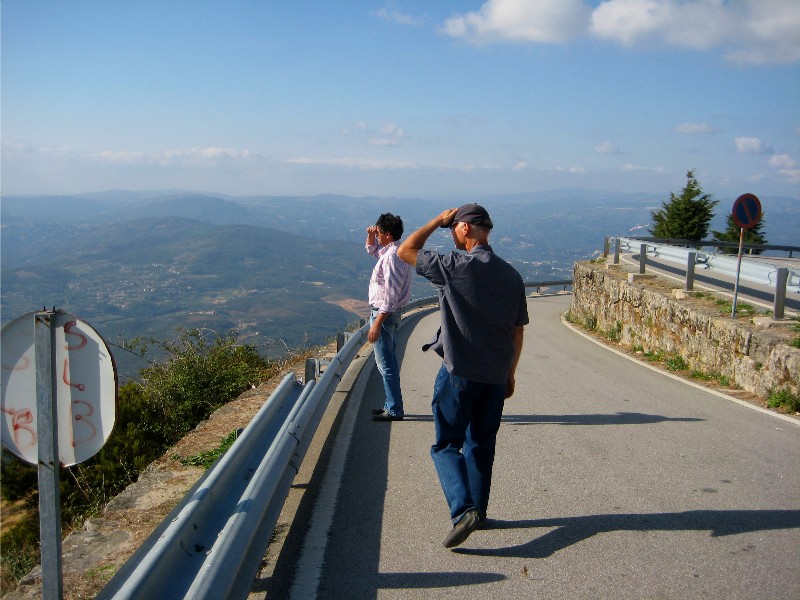 We share wonderful banter, with Ian translating much of it, but occasionally Cyndie’s Spanish allows her to understand more than I can, and they chuckle at something Carlos has said. I am left to wonder about the subtleties my mono-lingual limitation causes me to miss. On the ascent of Mt Graça, Ian discovers that they have added guard rails, which unfortunately block some of the view during the climb. Driving away from the waterfall, we had spotted thick smoke of a forest fire, and now as we climb the mountain, there are some clouds filling the sky and the air underneath them has grown very hazy, somewhat limiting our view. The road is painted with messages to cycling heroes. The Tour of Portugal cycle race (Volta a Portugal), a professional stage race held annually in August, includes a deciding stage with a climb up this mountain. At the top, the breeze blows just a bit cooler. It takes a moment to orient ourselves, and Ian and Carlos work to find the view of Carlos’s house. Eventually, it is located, but the haze makes it just barely identifiable.