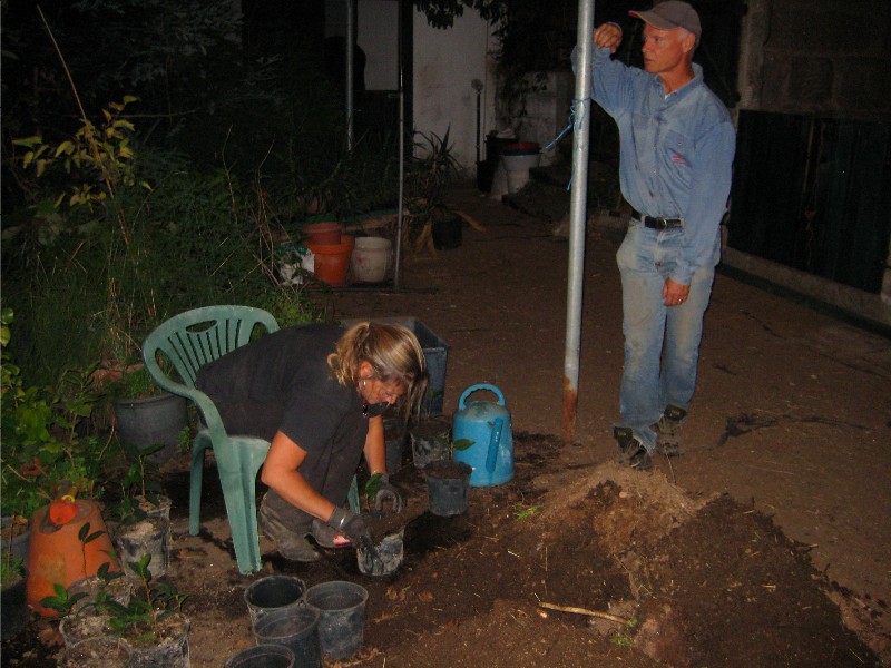 Ian and I stand by and assist Cyndie’s transplanting as the evening grows dark; so dark that Ian needs to turn on the back light before she gets to the last one. With that last task accomplished, we top off the day with our own little celebration of popcorn that Cyndie prepares, and a slide show of the pictures we captured during the day. The slide show finishes too soon and Cyndie asks to see pictures from the first day of our arrival, so we watch scenes we’ve seen before, but from what seems like a long time ago. When the slide show is interrupted by a phone call to Ian, from Victoria, we decide it’s a good place to break, which allows us to call it a night at a relatively decent hour.