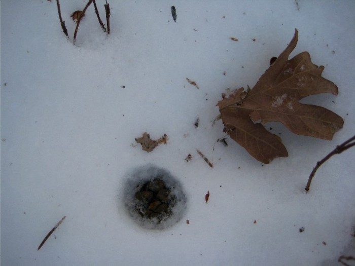 Some images defy me to put words on them. Try as I might, this one prevailed in stifling the voice in my head. Debris has collected on the old snow. A pine cone has melted a fairly deep hole. The barely detectable sprinkling of new flakes that fell yesterday subtly soften the details. The broken, yet half intact, dried leaf dominates the view, in stark contrast to the white space just opposite. The image speaks for itself. Old snow… mostly.