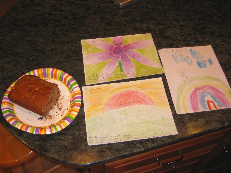 How do you thank someone for thanking you? Some things rise beyond words. You reach a level that is ethereal. Especially when it is between really special people. Even more so when those people are your next-door neighbors. Cyndie and I are lucky to enjoy the blessing of living next door to two really great families. On Easter Sunday, Elysa and Cyndie snuck next door and placed some baskets of goodies as a surprise treat for the Skattum kids. On Saturday, the kids delivered their response in the form of still-warm, fresh-baked banana bread (with chocolate chunks!), accompanied by their priceless artwork.