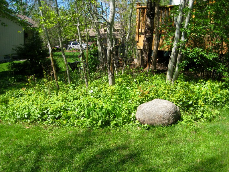 About this time, in stepped our wonderful neighbor, John Lawton, to offer a hand, a plan, and a better prying tool. Without a moment’s hesitation, John joined our rudderless effort, offering his help, regardless our not knowing where we were going with this boulder. The extreme difficulty in moving it helped to determine where we would ultimately place it. As short a distance necessary to move from out of sight to a very decorative spot on the edge of the trees.
