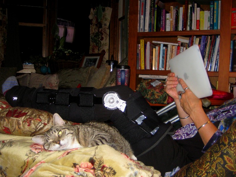 Cyndie is doing her best to entertain me by trying to beat me in a game of Scrabble on her iPad. Here she is scheming her next big word while Kitty opens one eye to see what I am doing. Kitty is being a good companion for Cyndie and has snuggled under the spot where Cyndie needs to prop her leg.