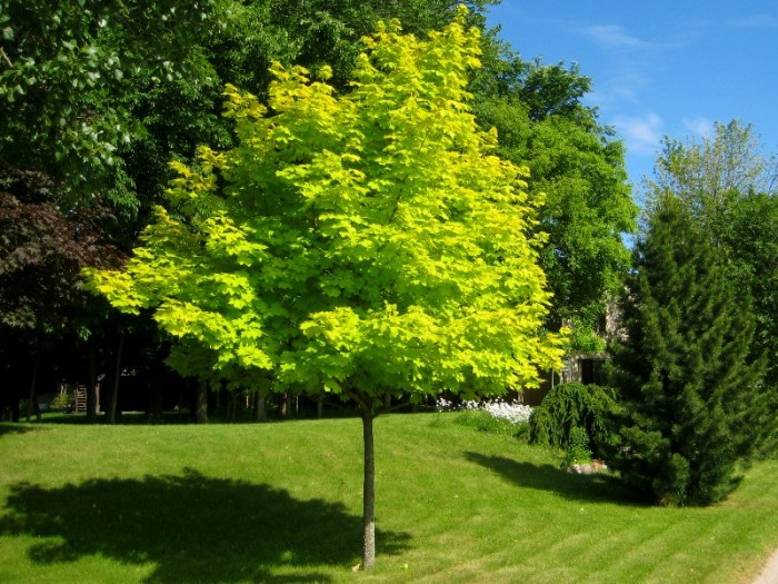 Check out this one. This is in the yard of a house down the street from us. Some days when I drive past, it looks like it is plugged into some source of illuminating electricity. The vibrancy jumps out from the muted background of everything around it. I don’t think it ever changes its hue. In the spring when it sprouts leaves, I get the impression the brilliant color is because the leaves are new. When I notice the fluorescent glow again in the middle of summer, I catch myself wondering if the tree thinks autumn is already here. After passing it repeatedly through all seasons, it begins to dawn on me that it always displays this day-glow color. I think of it as a gift from the owners of that property, allowing us to continually witness the extraordinary resplendence, and it brings a smile, every time I drive past.