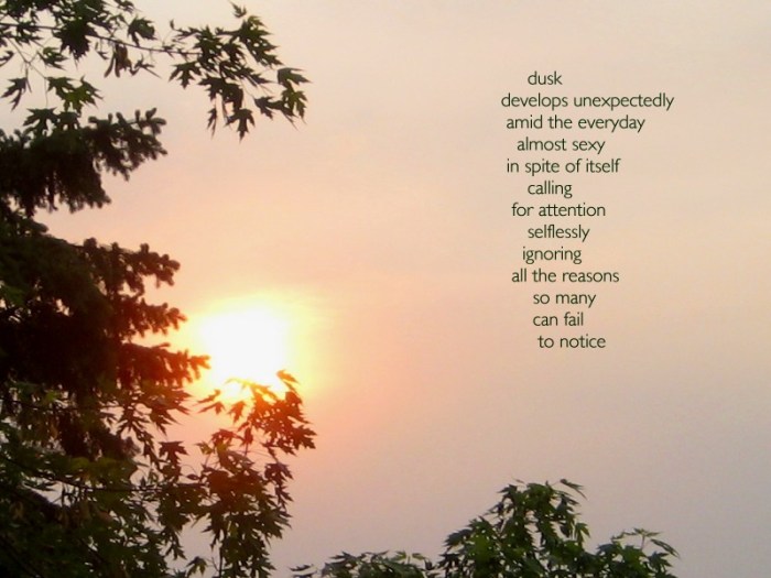 With the low light of dusk, the auto settings of my camera captured a fair amount of blur from the kids in motion. I like the effect that creates. I also like the one person lying on the grass, looking skyward as the action is happening beyond him. I sense the lingering reverberations of the kid’s excited shouts and the collection of adult voices in conversation that were happening at the time, behind the camera’s field of view.