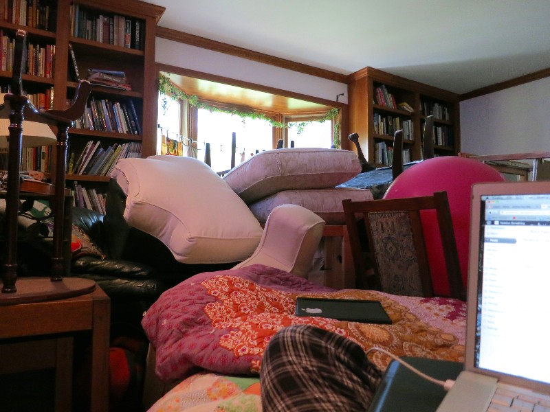 Heck, it doesn’t even deserve to be framed as an inconvenience, if I were willing to go that far. I could embrace this with a purposefulness that sees it as my primary accomplishment. This is exactly what I am supposed to be doing: living in my little one-room “fort” that I have created, surrounded by the upturned legs of furniture stacked around me.