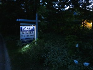 The sign that doesn’t say, “For Sale” on the corner of our lot (I guess it implies it), lights up at night. It occurs to me that a person driving around to look at houses for sale would be unlikely to do so in the dark of night, so I’m not sure about the value of this feature, but it is cool, anyway.