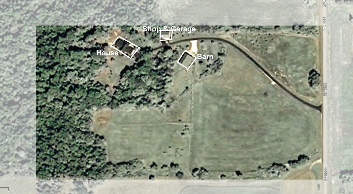 The log home sits on the highest point on the property, with the land sloping away on all sides. The entrance of the long driveway offers no view of the buildings and climbs upward for the first third of length, then drops down toward the level of the barn, then rises up to the house.
