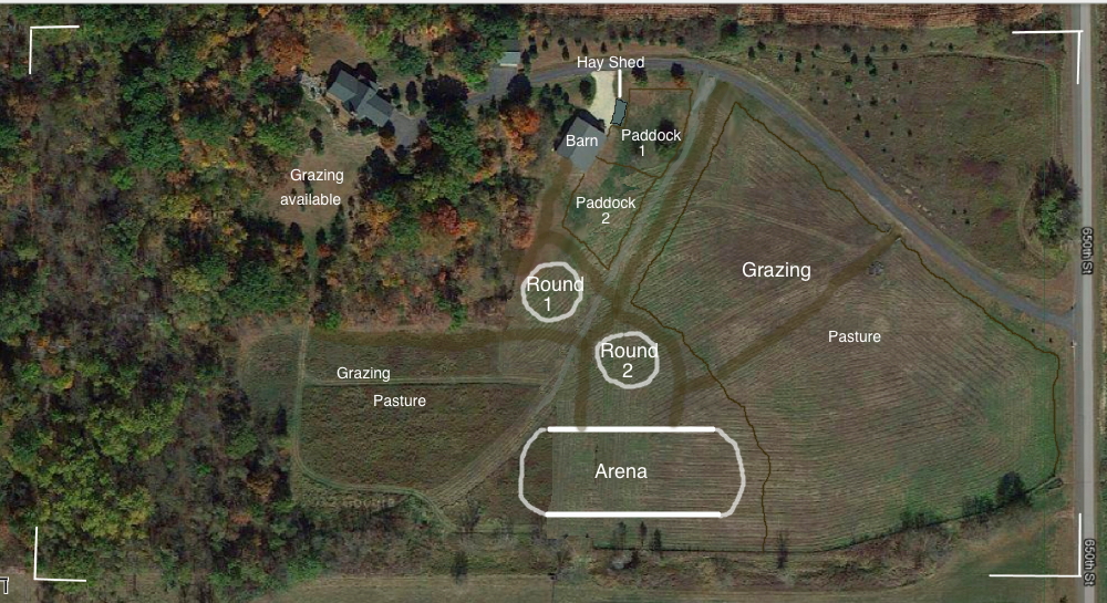 We are all about possibilities. The design of our layout, including traffic routes of people, horses, and tractor; location of the round pens; dimensions of the paddocks; location of the automatic watering trough; location for storage and management of manure; location and type of hay storage facility, …are all in play right now. We meet, once again, with our fence installer this afternoon, to discuss the layout of our two paddocks, and whether we are ready to pull the trigger and begin installation.