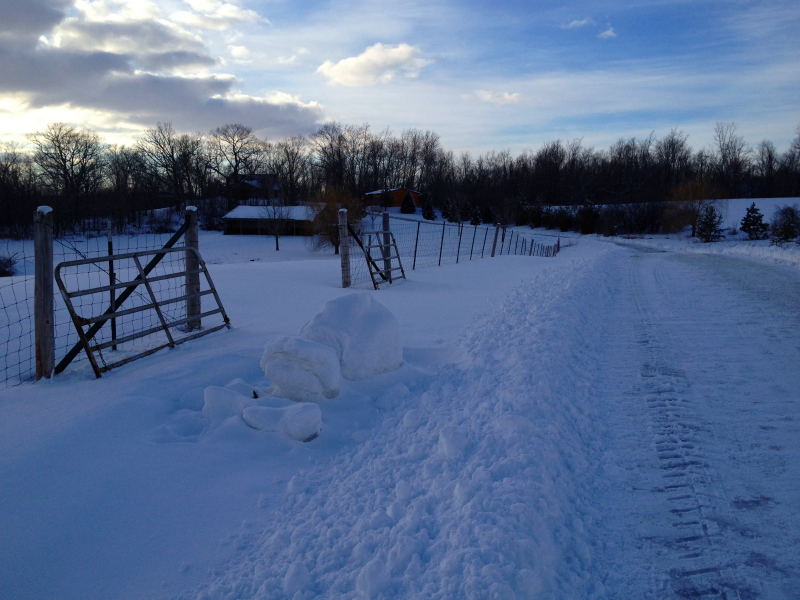 I don’t have time to compose a proper description of my exciting day on the ranch, yesterday, so I’m going to leave you with a couple pictures to enjoy. Overnight, between Wednesday and Thursday, we received around 3 inches of snow. It was mighty purdy! I think I mentioned that our snowman didn’t survive the winds. He got toppled over the night we made him.