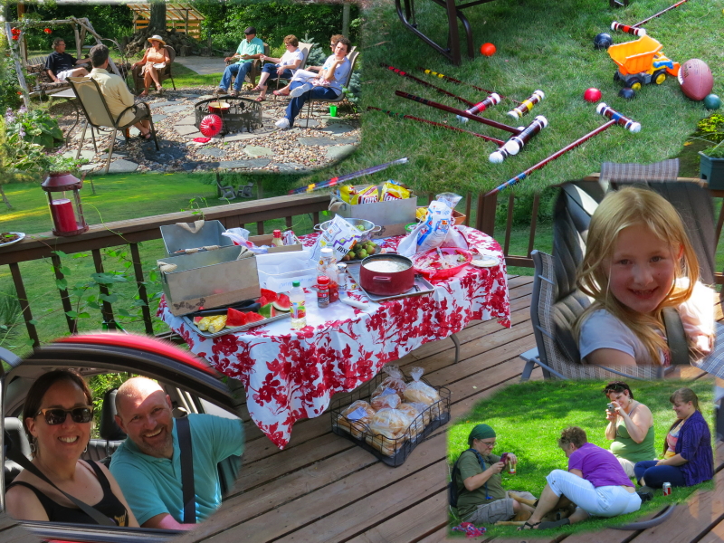 It was a beautiful summer day yesterday for us to showcase our place for friends. Delilah got loads of attention, and was a charm the whole day. I walked our trails several times, guiding tours. I noshed and nibbled all afternoon, to my heart’s delight. Unfortunately, I didn’t pull the camera out more than once or twice, because I was so occupied with having a wonderful time that I kept forgetting to capture all the fun in pictures. Here’s a collage that samples some of the atmosphere of our grand day.