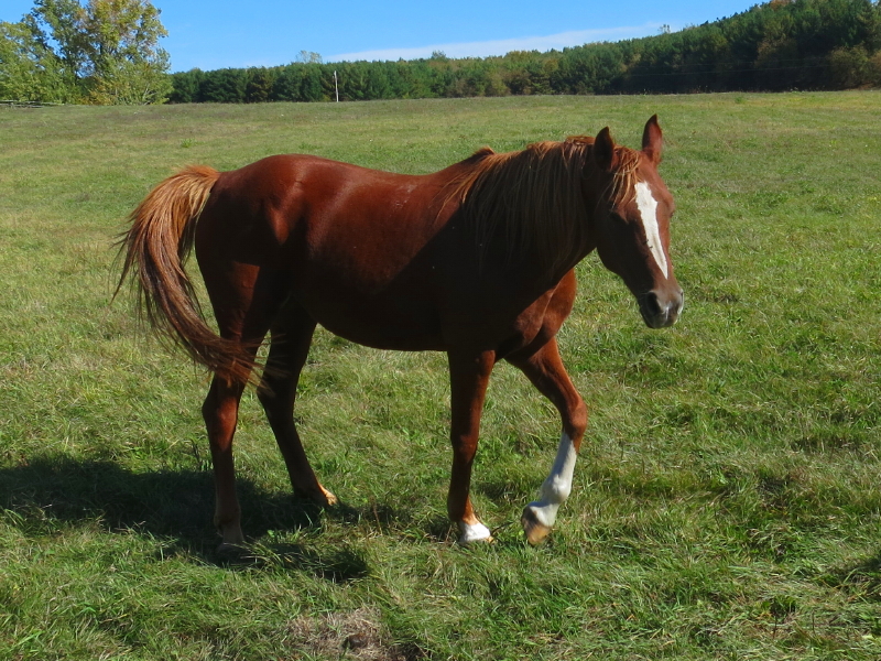 Dezirea has the most markings of the three chestnuts. She has a blaze on her face, a stocking on her left front leg, and an anklet (half pastern) on her right front leg. She is the only one of the herd who hasn’t been ridden, as her primary duties were as a brood mare.