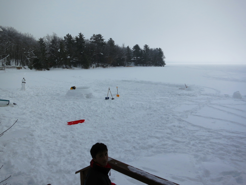 Then we started work on building an igloo with my framing device. At the same time, shoveling began to create a small rink for boot hockey. Cyndie and Dunia passed by on snowshoes, and after returning from a long adventure, they initiated rolling snow into large boulders. Soon, the classic form of a snowman appeared, adorned with a scarf and carrot nose.