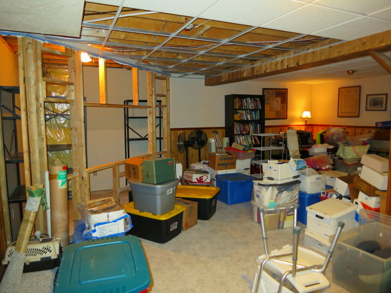 In preparation of the builder taking down the studs and putting up new walls to make a more functional storage space, I pulled off the drywall and removed all the screws from the studs. Friday night, Cyndie and I removed all the stuff that was stacked behind that wall and piled it up around the basement. It is a real optical illusion of space to see that little corner empty, but the contents now appearing to consume the entire rest of the room.
