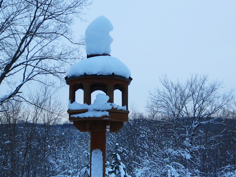 The snow seems to cling to everything, sometimes to comical effect. The little peak of this bird feeder continues to sport a big tower of snow that sticks together and hangs on.