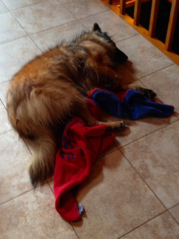 Our water-loving dog, Delilah, is mad about helping me get the water to flow. She runs up and down the channels and tries to bite the water wherever it ripples or gurgles. I like it when she helps down here because the ground isn’t muddy and the water is clean, so she just gets wet. The running back and forth does wonders to burn off her otherwise endless energy. When we came in, I toweled her off as she lay on her back, and then she curled up with the towel and took a nap.