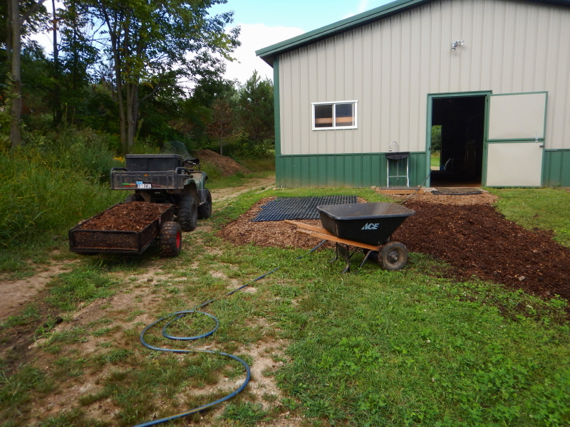 The storage and distribution system I naively devised over time worked adequately for this first year, going from having none at all to a year’s-worth. Now we are approaching the point of starting the second year with a lot less open storage space. It is roughly half-filled with composting manure right now.