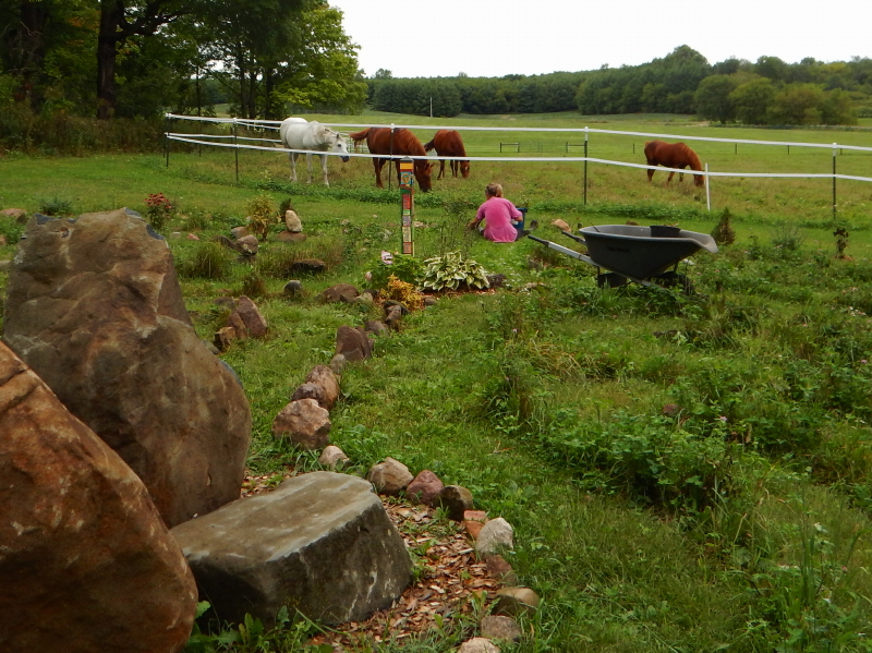 On Saturday, Cyndie and I enjoyed some blissful moments tending to our labyrinth garden. The horses noticed our activity and wandered over to graze beside us while we toiled. Cyndie pulled weeds and I did some rock-work to add robustness to the entrance of the center circle.