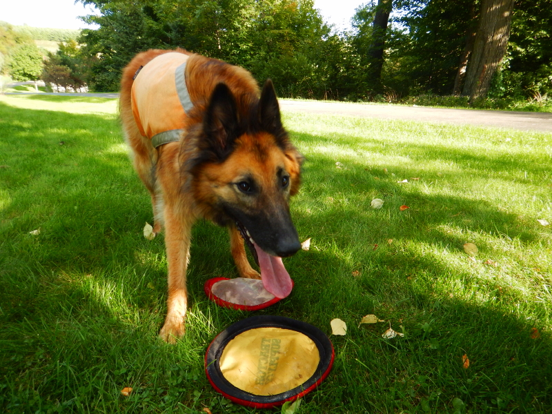 To mix things up, sometimes we throw discs for her to chase, instead. She loves leaping for them, when we get the throws right. She makes us laugh when she scrambles to try to pick up both discs at the same time. I expect she will hone that skill, too. I might as well start looking now for a third one of those, as well.
