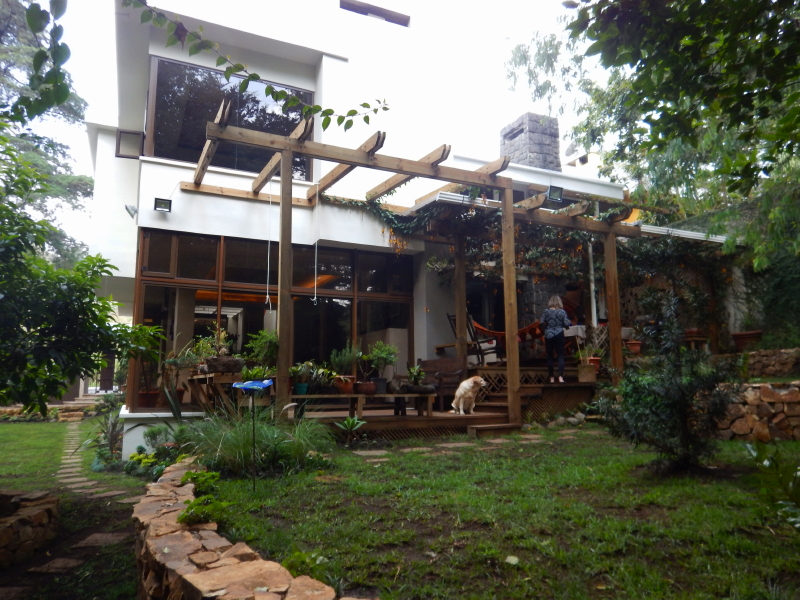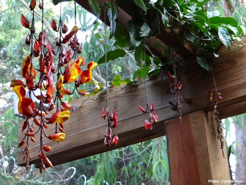 A view of the back of their house and the beautiful hanging blossoms over the deck.