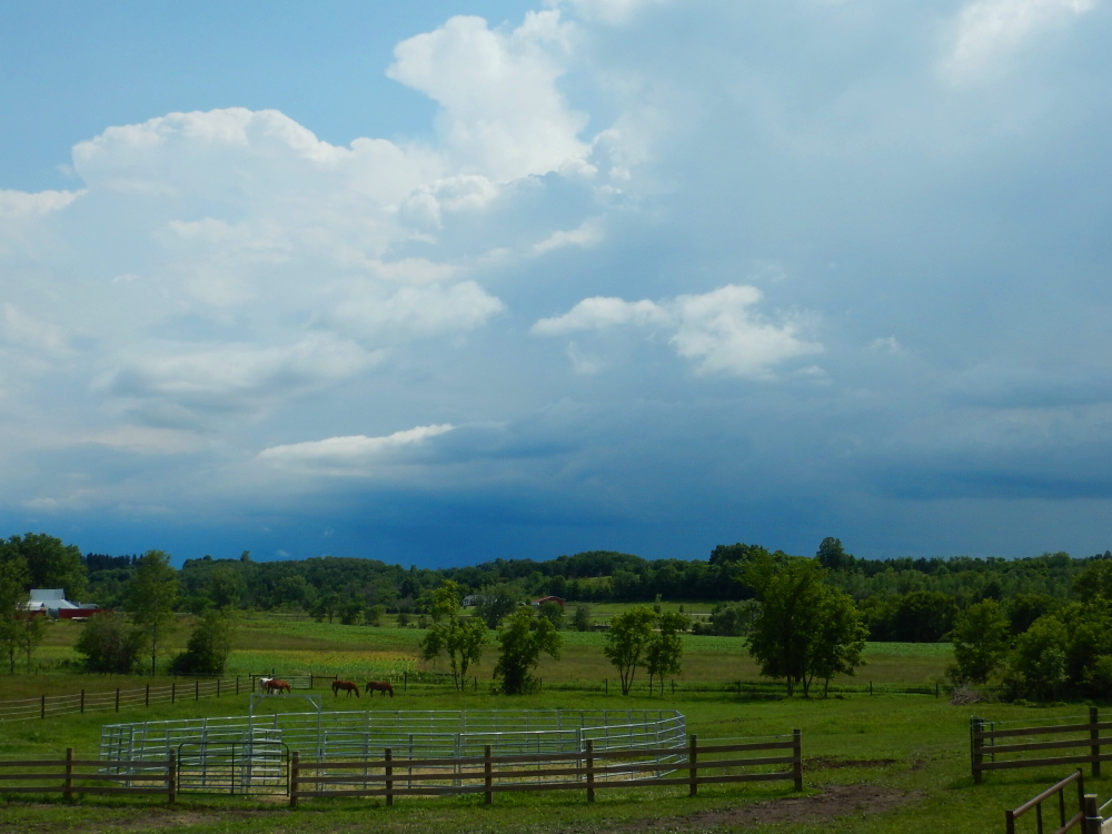 I did pause briefly while trimming, to take a picture of the sky over the grazing horses. It didn’t cause them to alter their behavior one bit. They gladly continue munching grass, rain or shine.