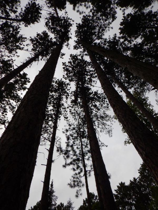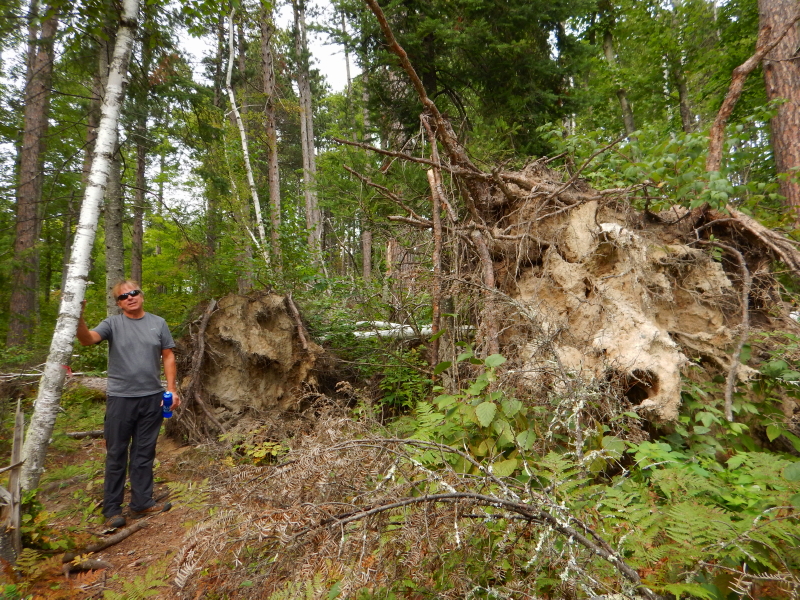 There are hazards hanging everywhere, in the broken tree tops that linger, defying gravity overhead due to a number of precarious circumstances. One decent sized tree appears to have broken off and blown directly against an adjacent tree where it now clings by mere branches, hanging in a very normal vertical orientation, though with no bottom half connecting it to the earth.
