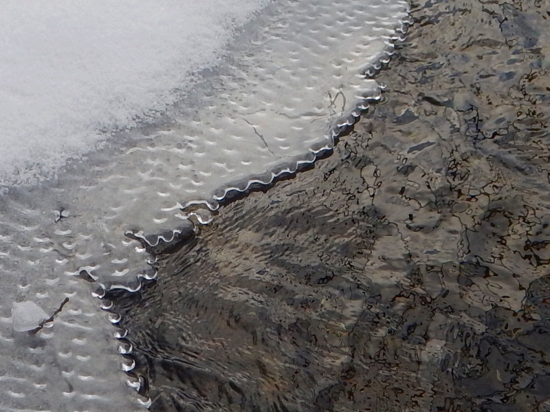 This next one is mine. I took a picture of the water flowing beneath a dam, wanting to capture the water droplets on the edge of the forming ice. After zooming in, I was surprised to find the lines that look like a drawn-in animation. A moment after that, the whole thing took on a look of being more a painting than a photo. I’m really happy with it.