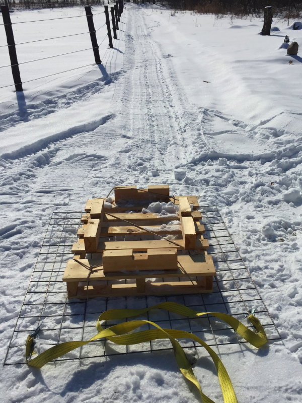 In response to a suggestion from George about making a trail groomer, I dug out a piece of goat fence and a pallet to see if something that simple might do the trick.