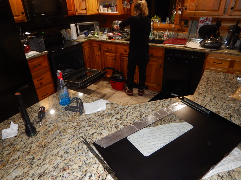 I asked permission to remove some screws so we could get to the space between the windows in the oven door. There was a cobweb in there that has bothered me for a long time. Soon, we had all the kitchen appliances in pieces, and we were cleaning nooks and crannies that have probably never been cleaned before.
