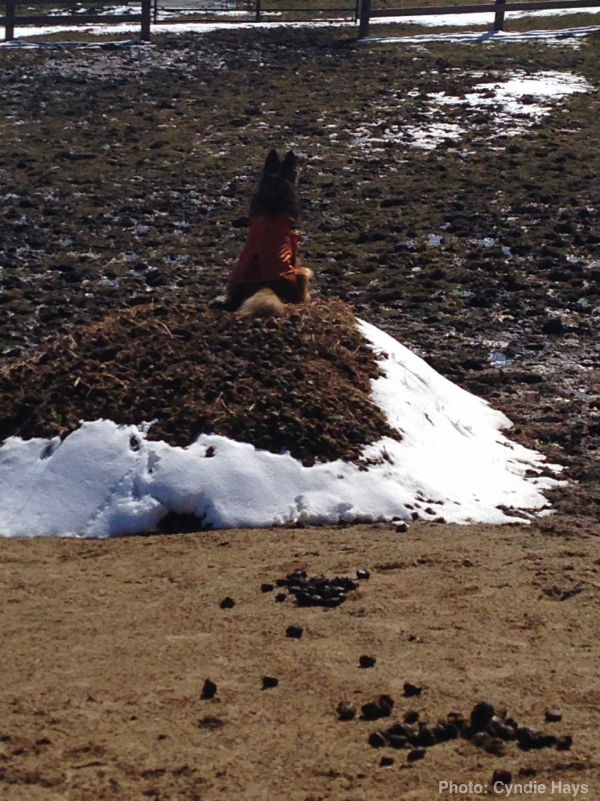 Last week, when the snow was rapidly vanishing in the sun, Cyndie captured this poignant portrait of Delilah perched regally on one of the manure piles in the paddock.