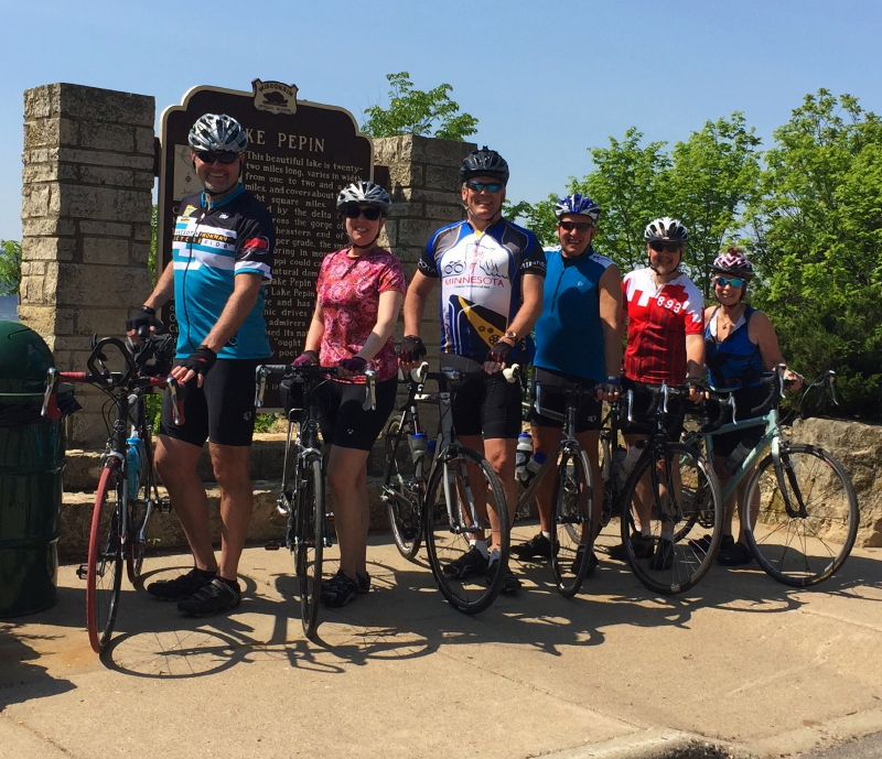 It was about as pleasant a day yesterday as we’ve had lately for bike riding, with minimal wind and plenty of blue sky. Just perfect for a training ride that was planned to help us get some miles in before the Tour of Minnesota next month. Five friends that I met years ago on the annual week-long biking and camping adventure, back when it was led by Jim Klobuchar, gathered in Red Wing to spend a few hours pedaling around Lake Pepin.