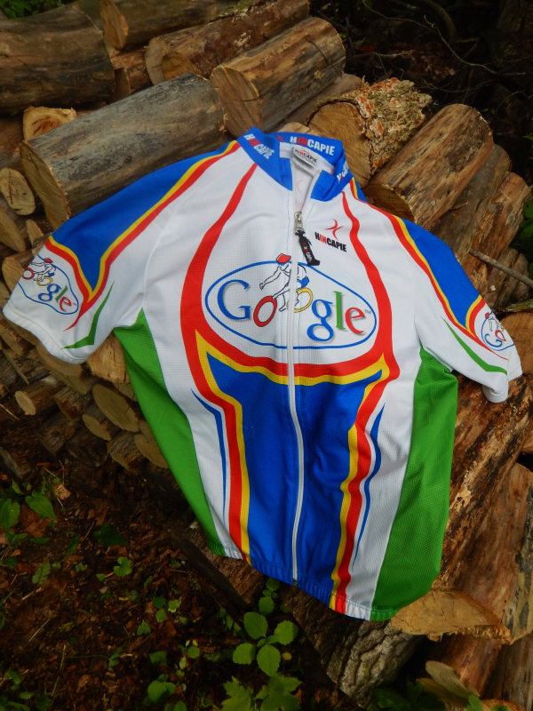 In the days ahead, I will be presenting a tour of my favorite biking jerseys. First up, my Google jersey, draped on wood needing to be split. A bunch of years ago, the kids gave me this gem for Father’s Day, a day which coincidentally tends to fall on the Sunday of this annual bike trip.