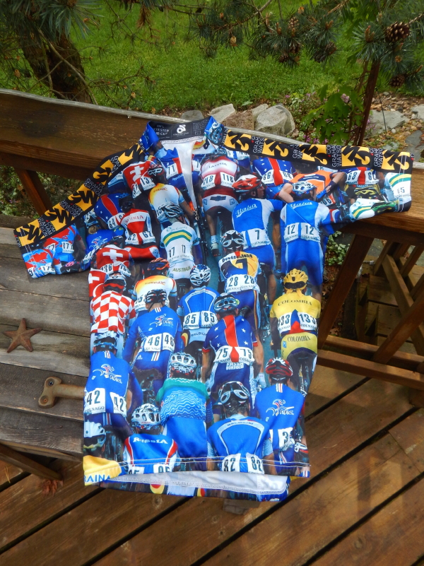 Today we have a classic Graham Watson jersey on the deck railing. I first spotted one of these jerseys on another rider in our group. Being a big fan of cycle racing and Graham’s cycling photos, I was won over instantly and felt a need to have one of my own. I actually asked Ed Beckers if he would find it disagreeable if I wore the same jersey as him. With his approval, I bought one for myself.