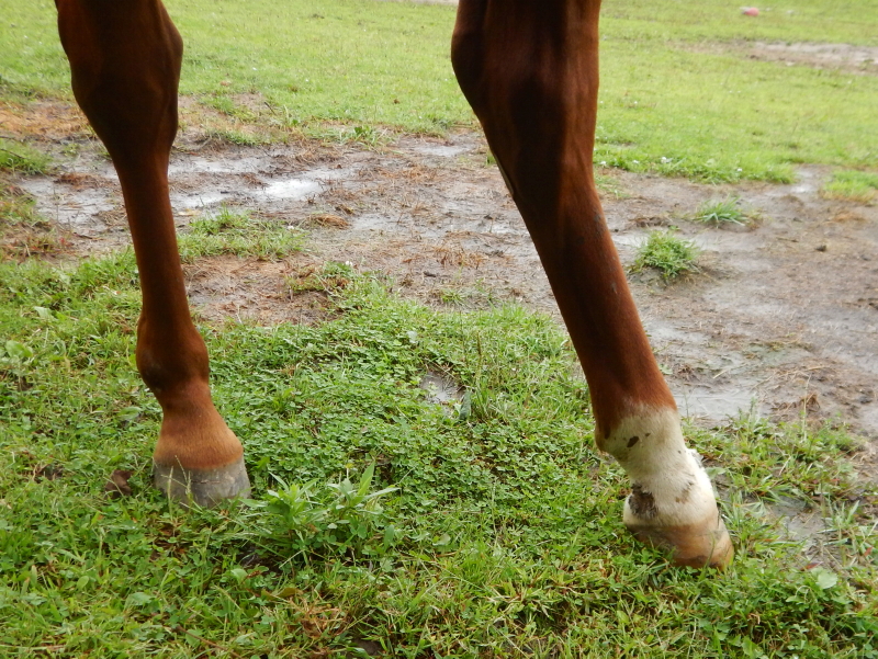 What now? Last week, Cyndie alerted to what she thought was a cut wound above one of Hunter’s back hooves. She tried treating it by washing and applying an antiseptic and then we went away for the weekend. Upon our return, it appeared to be scabbing over, but it also seemed to be spreading.