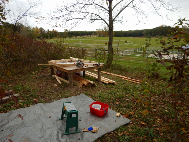 We worked on framing the walls of our chicken coop yesterday under October conditions that changed from cold to warm and alternated between sunny and gray. Twice we received sprinkles of very light rain, yet at a time when there weren’t any clouds in sight that looked like they could possibly be the source.