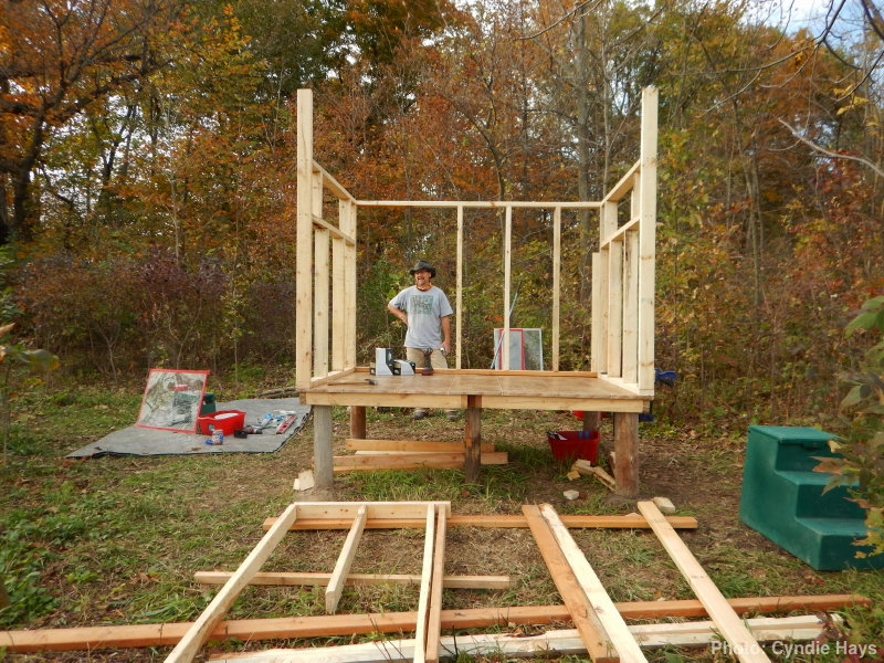 The weather didn’t slow us down from the task at hand, though, as we designed on the fly to figure out a way to use on-hand 2x4s from a variety of salvaged day-job pallets to frame up the four walls.