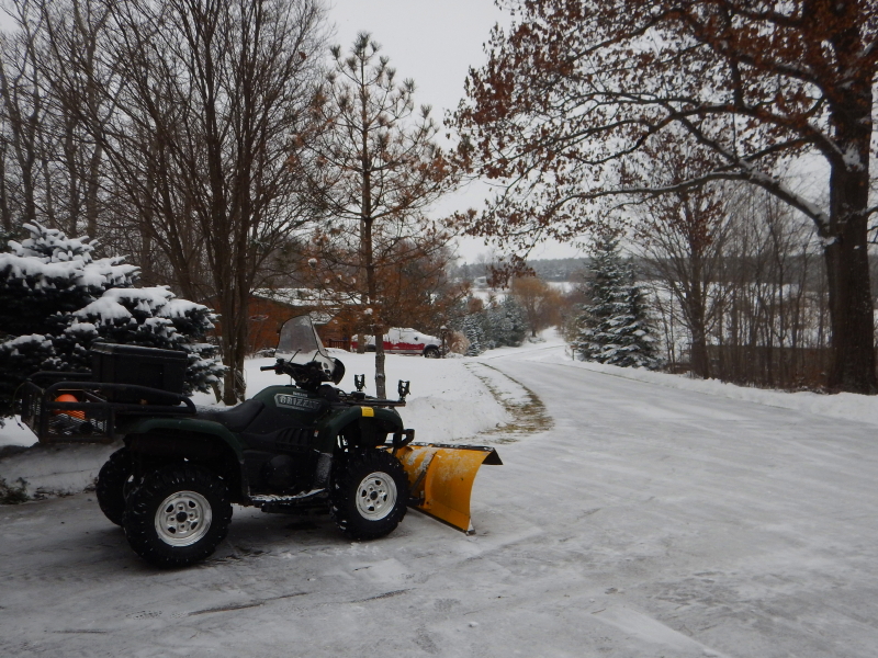 It has been a long time since I plowed snow with the Grizzly, but in minutes I was back in the routine. Down with the blade, forward gear. Up with the blade, reverse. Back and forth, to and fro. Snow flowing off the blade, off the driveway, and into the ditch.