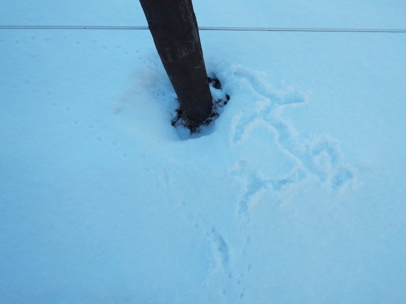 I was about to declare rabbits as the only animals moving around yesterday until we reached about three-quarters of our travel to the barn and came upon some tracks from much smaller feet. I’m thinking they were probably squirrels or chipmunks.